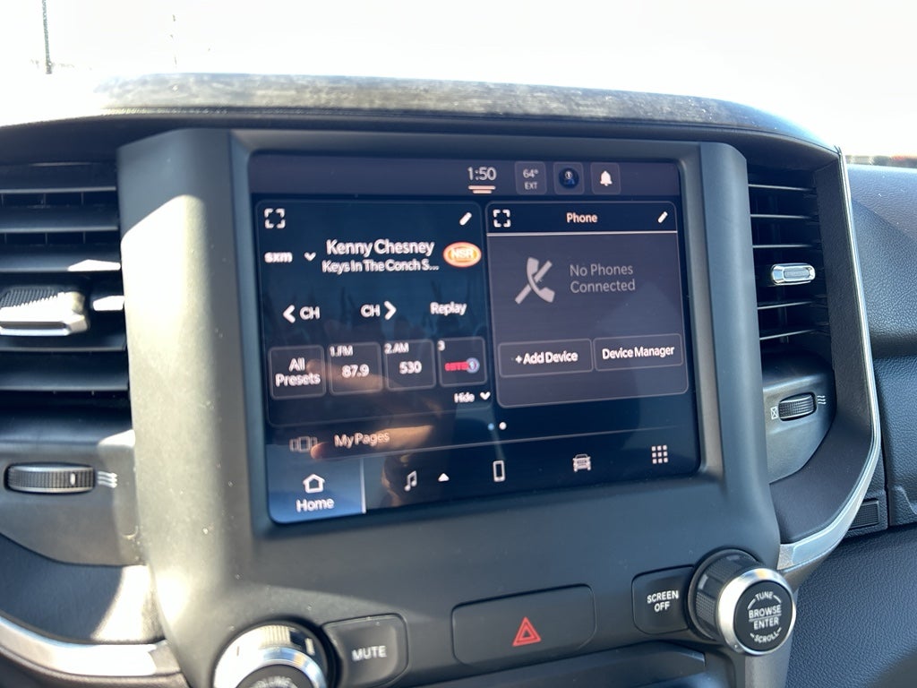Quick Order Package 2GZ Big Horn. Bed Utility Group: MOPAR Spray in Bedliner; MOPAR Deployable Bed Step; LED Bed Lighting. Level 1 Equipment Group: Google Android Auto; SiriusXM Radio Service; Bluetooth® Handsfree Phone and Audio; Integrated Center Stack Radio; For Details. Visit DriveUconnect.com; For More Info. Call 800-643-2112; Leather Wrapped Steering Wheel; Rear Dome with On/off Switch Lamp; Front Fog Lamps; Integrated Voice Command with Bluetooth®; Connectivity - US/Canada; Premium Cloth 40/20/40 Bench Seat; Glove Box Lamp; Auto Power-Folding Mirrors; Footwell Courtesy Lamp; 4G LTE Wi-Fi Hot Spot; GPS Antenna Input; Exterior Mirrors with Heating Element; Global Telematics Box Module; Mirror Running Lights; Uconnect 5 W Radio with 8.4" Display; 8.4" Touchscreen Display; Foam Bottle Insert (door Trim Panel); Black Exterior Mirrors; 18" X 8.0" Polished Aluminum Wheels; Apple CarPlay; Big Horn Instrument Panel Badge; Power Adjustable Convex Aux Mirrors; Forward and Reverse Utility Lights; Locking Lower Glove Box; Selectable Tire Fill Alert; SiriusXM Satellite Radio; Power Heated Fold Telescope Mirrors; Exterior Mirrors with Supplemental Signals; Steering Wheel Mounted Audio Controls; Exterior Mirrors Courtesy Lamps; Dual Glove Boxes; Center Hub; Power Adjust Mirrors; 2nd Row in Floor Storage Bins; Power Telescoping Mirrors. Protection Group: Tow Hooks; Transfer Case Skid Plate Shield. Premium Cloth 40/20/40 Bench Seat. Chrome Flat Cab-Length Side Steps. MOPAR Spray in Bedliner. 9 Alpine Speakers with Subwoofer. Anti-Spin Differential Rear Axle. Billet Silver Metallic CC. Front Fog Lamps. Tow Hooks. **Equipment listed is based on original vehicle build and subject to change. Please confirm the accuracy of the included equipment by calling the dealer prior to purchase.**